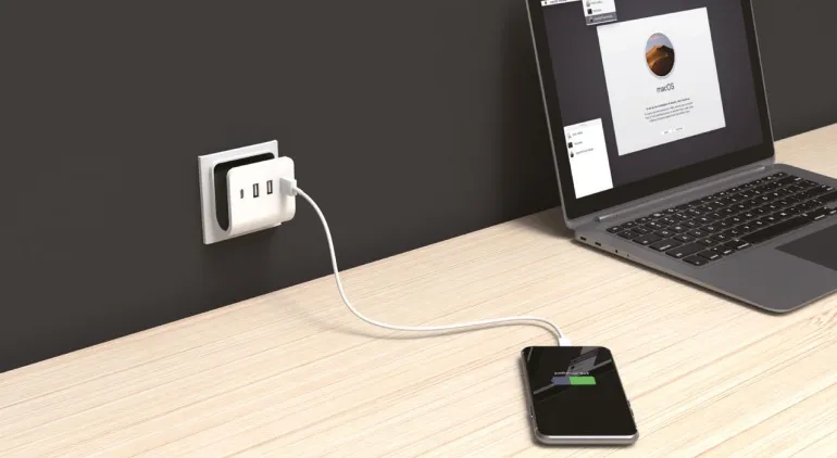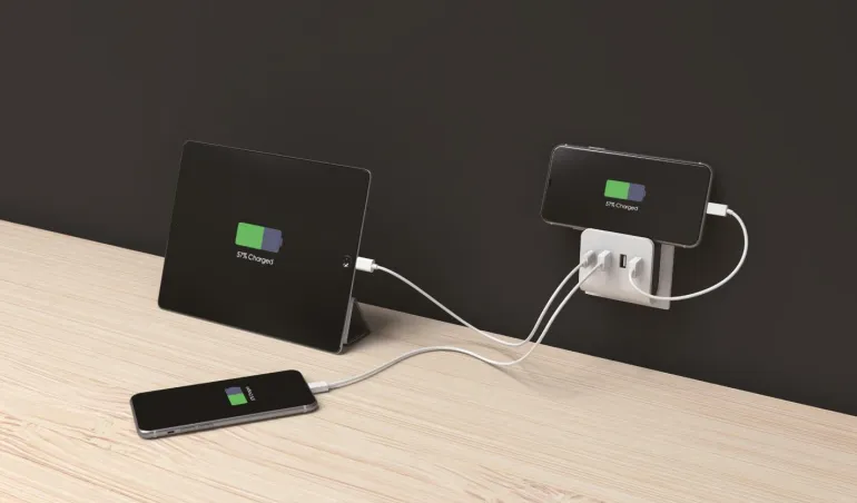 Virrankulutus valmiustilassa 0,08 W. Tarjoaa yhteensä 4,8 A (maks. 3,0 A/USB-C-liitäntä sekä 2,4 A /USB-A-liitäntä).
