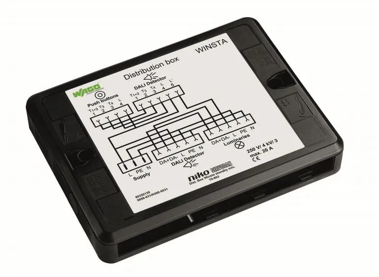 Winsta-haaroitusrasia minimoi valmiustilan DALI-master-läsnäoloanturin avulla. Rasia mahdollistaa valaisimien virransyötön katkaisemisen kokonaan (0 wattia), kun valaistus ei ole päällä. Mukana pikaliitin painikkeeseen, 4-napainen urosliitin, Winsta-mallit 770-254 + 770-504, pikaliitin syöttöjännitteeseen, 3-napainen naarasliitin, Winsta-malli 770-103.
