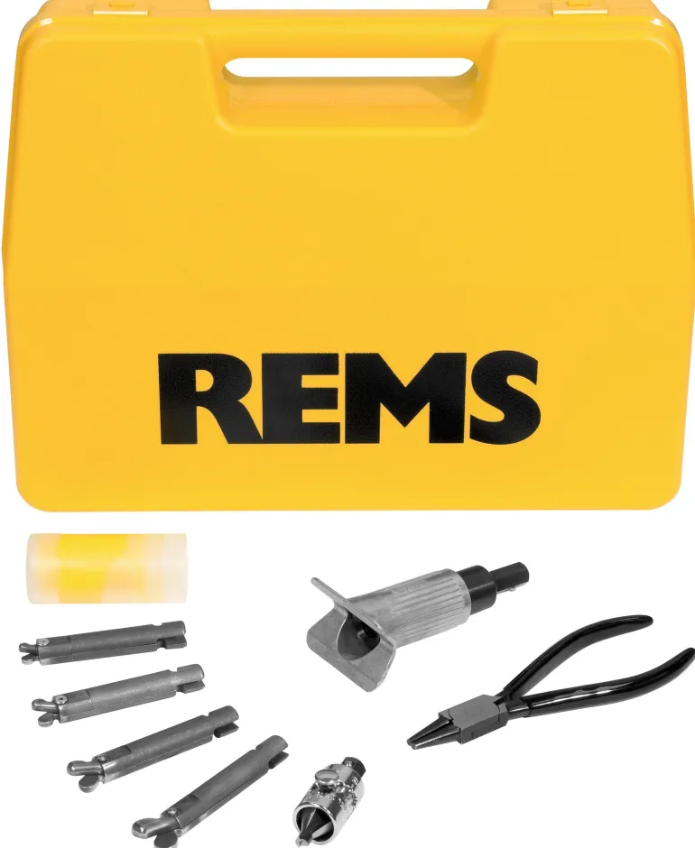 REMS Hurrican H Set. Manuaalinen haaroitustyökalu koville ja pehmeille kupariputkille Ø12 – 22 mm, s < 1,5 mm. Taloudellinen käsityökalu haarojen järkevään tuotantoon liittimettömiin putkiasennuksiin. Haaroitustyökalu 12, 15, 18 ja 22 mm:n putkille. Tukevassa kotelossa.