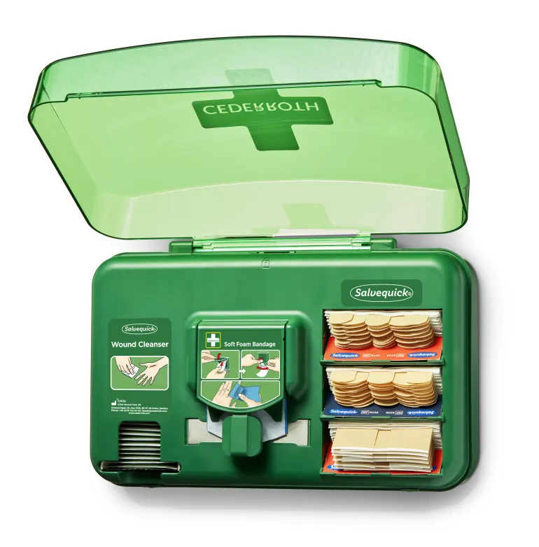Cederroth 51011006 on haavanhoitoautomaatti, jossa on kaikki tarvittava pienten haavojen hoitoon. Kätevä ratkaisu ensiapuasemien täydentäjänä työpisteissä, joissa laastareiden tarve on ilmeinen.