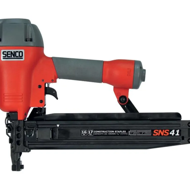 Senco SNS41 on hakasnaulain 25–50 mm pitkille hakasille. Mittari 16 Ga. Ergonominen kahva takaa miellyttävän työskentelyasennon, säädettävä puhallustoiminto.
