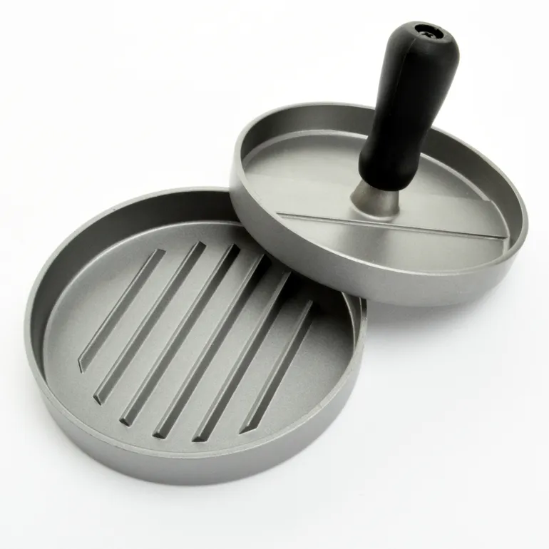 Hampurilaispihvipuristin (Ø12 cm) uurretulla pinnalla, joka tekee erilaisien hampurilaisten valmistamisen helpoksi. Valmistettu alumiinista ja kahva muovista.