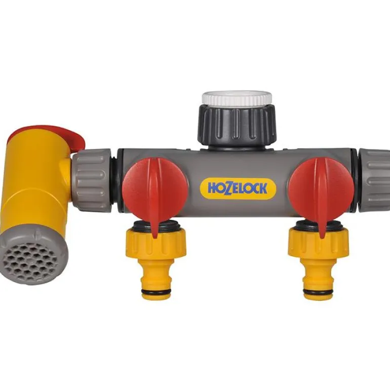 Hozelock 2250 on kolmikanavainen hanaliitin, jonka avulla voit liittää kaksi kastelulaitetta tai letkua suoraan ulkohanaan. Samalla saat pysyvästi käyttöön kolmannen ulostuloaukon, jota voi pyörittää. Voit täyttää ämpäreitä ja kastelukannuja irrottamatta muita liitäntöjä.
