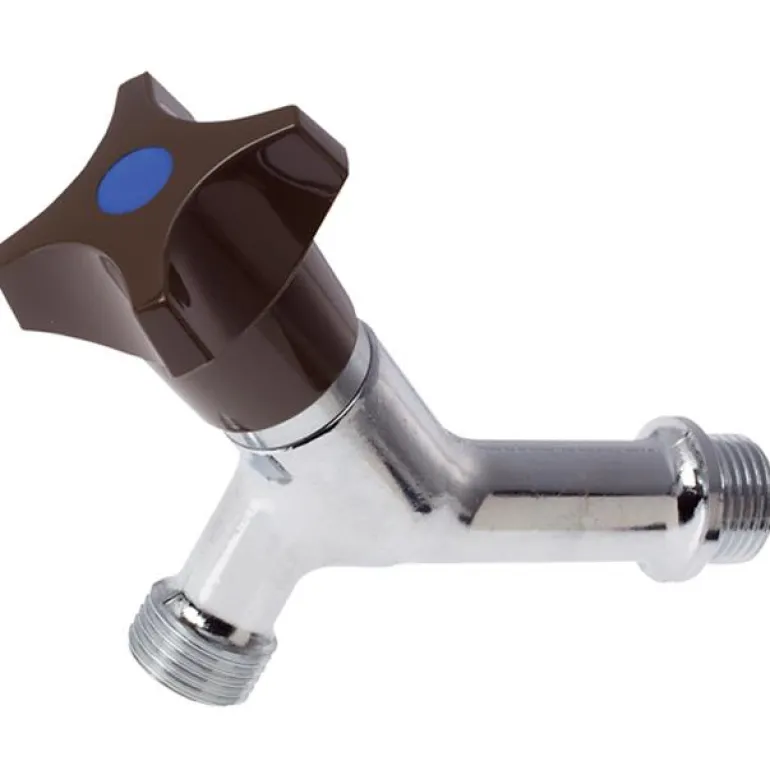 Kromattu hanaventtiili seinään, vakiomalli. Mukana letkuliittimet. Hanaventtiilin ulkonema on 76 mm, G15-ulkokierre liitäntää varten.