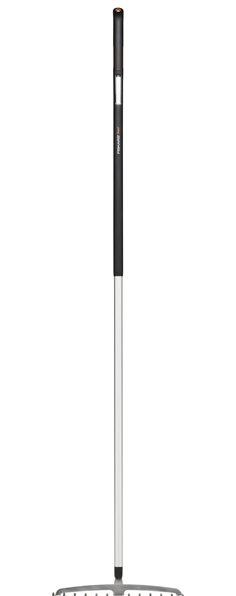 Harava, jonka päällä on tasoituslapa. Ruostumattomasta teräksestä valmistettu haravapää. Varsi karkaistua alumiinia. 25 vuoden takuu.