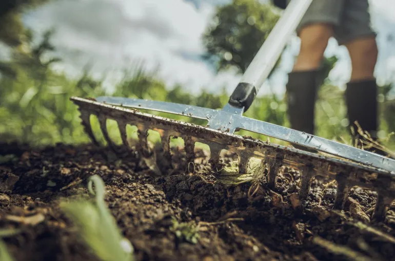 Harava, jonka päällä on tasoituslapa. Ruostumattomasta teräksestä valmistettu haravapää.