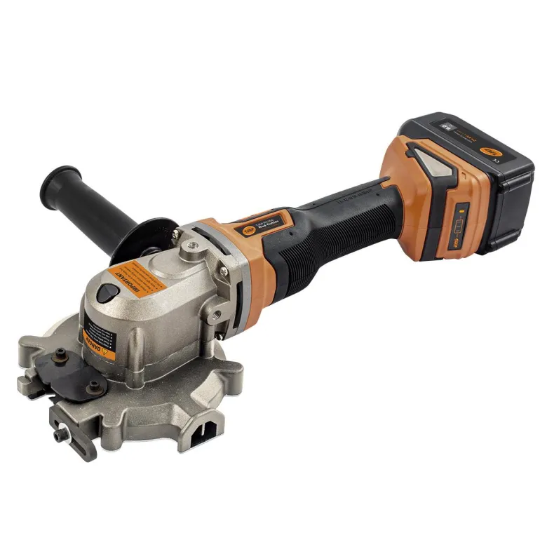 Vahva akkutoiminen leikkuukone harjateräksen tasoleikkaukseen. Pystyy leikkaamaan harjateräksen tasaisesti.