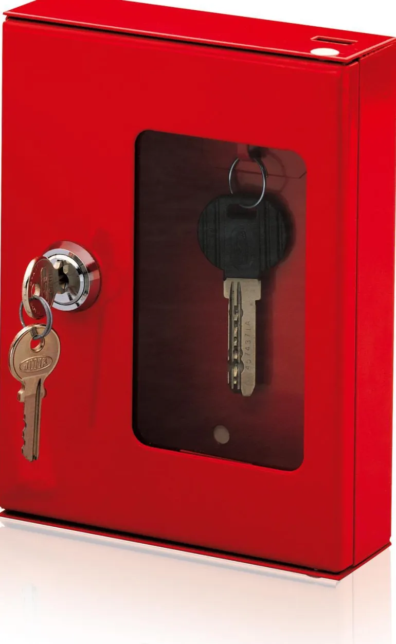 Punaiseksi lakattu teräskaappi lasiruudulla (lasin mitat: 100 mm x 60 mm). Sylinterilukolla.
