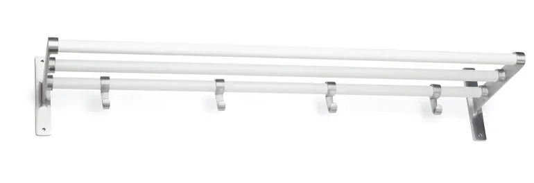 Tyylikäs naulakko, päädyt ja koukut alumiinia. Tangot muovipinnoitettua terästä. Vaatteiden ripustamisen lisäksi soveltuu sekä hattujen että kenkien säilyttämiseen.