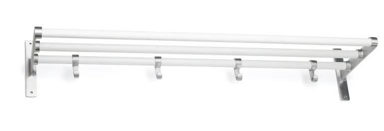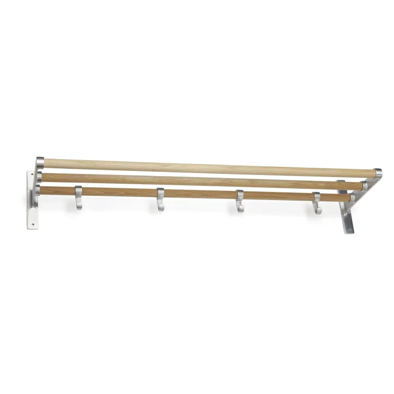 Tyylikäs naulakko, päädyt ja koukut alumiinia. Tangot tammea. Vaatteiden ripustamisen lisäksi soveltuu sekä hattujen että kenkien säilyttämiseen. Toimitus osina.