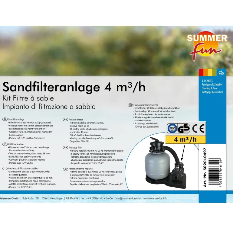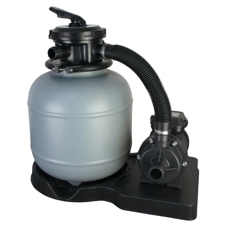 Normaalisti imevä XS-hiekkasuodatinjärjestelmä, 4 m³/h, jossa on suodatinlevy, 6-tieventtiili ja 200 W:n (0,27 hv, 230 V / 50 Hz) ottoteho. Hiekkasuodatinjärjestelmässä on Ø 300 mm:n suodatinsäiliö, jossa on Ø 38 mm:n letkuliitin ja noin 20 kg:n täyttömäärä hiekalle. Mukana suodatinsäiliö, pumppu ja putkiliittimet.