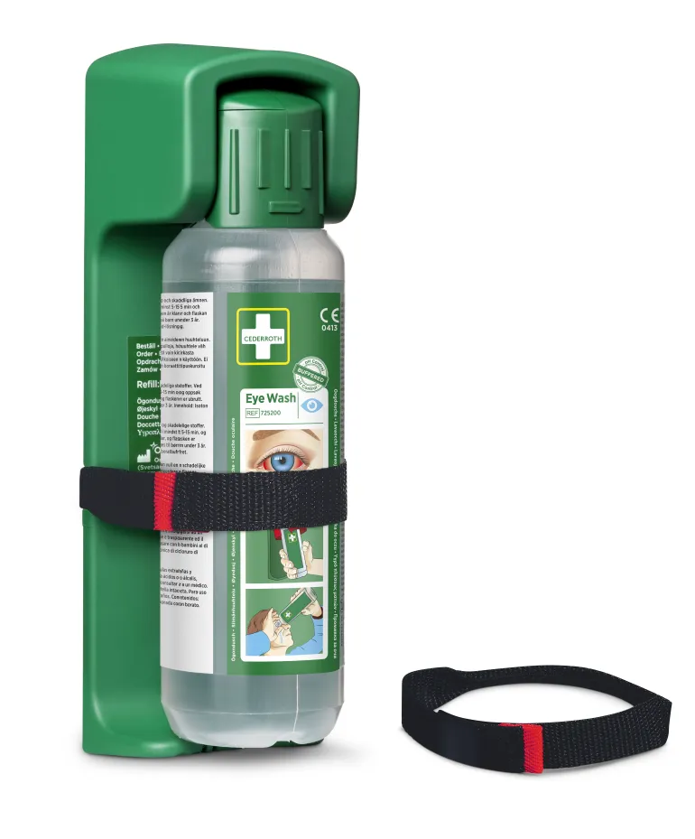 Hihna seinäpidikkeeseen. Antaa lisää tukea silmäsuihkepullolle, kun se sijoitetaan epävakaaseen ympäristöön, kuten kuorma-autoon, metsätyökoneeseen tms.
