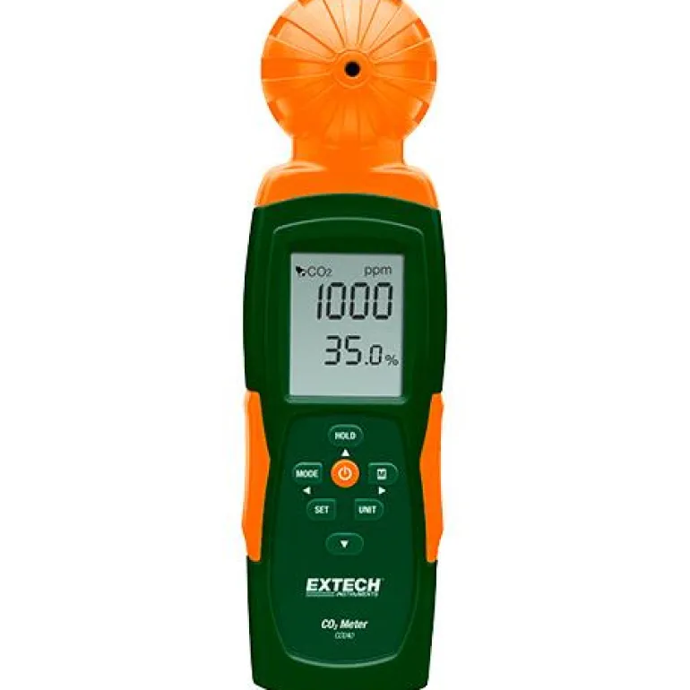 Extech CO240 on hiilidioksidimittari, joka mittaa hiilidioksidipitoisuuden, ilman lämpötilan, ilmankosteuden, kastepisteen ja märkälämpötilan. Käytetään suljetun ympäristön ympäristöolosuhteiden mukauttamiseen, esim. kasvihuoneen optimointi kasvien viljelyyn.