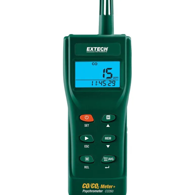 Extech CO260 -hiilidioksidimittari soveltuu CO₂-pitoisuuksien mittaamiseen kouluissa, toimistorakennuksissa, kasvihuoneissa, tehtaissa, hotelleissa, sairaaloissa, kuljetuslinjoissa ja muissa kohteissa, joissa muodostuu korkeita hiilidioksidipitoisuuksia. Soveltuu käytettäväksi esimerkiksi pannuhuoneissa ja varastoissa, joissa käytetään propaania, sekä bensiinikäyttöisissä kohteissa, kuten hisseissä, veneissä, lentokoneissa, asuntoautoissa ja tuotantolaitoksissa. CO260 mittaa myös ilman lämpötilan / suhteellisen kosteuden ja laskee kastepisteen/lämpötilat. Sisäisellä muistilla ja ohjelmistolla varustettu malli mahdollistaa jopa 99 lukeman manuaalisen kirjaamisen tai jatkuvan luennan (enint. 32 000 lukemaa).