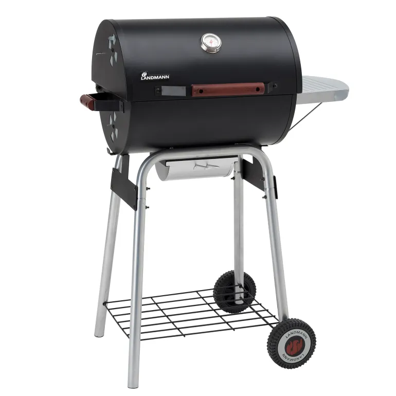 Landmann Black Taurus 440 on tynnyrinmuotoinen hiiligrilli irrotettavalla sivupöydällä, kätevällä tuhkankerääjällä ja lisäritilällä, joka tarjoaa lisää tilaa ja jolla voit pitää ruokaa lämpimänä. Korkeussuunnassa säädettävä grilliritilä mahdollistaa helpon lämpötilan säädön. Kätevä kahva yhdessä kahden pyörän kanssa tekevät grillin siirtämisestä helppoa. Integroitu lämpömittari kannessa. Grillipinta: 44×36 cm.