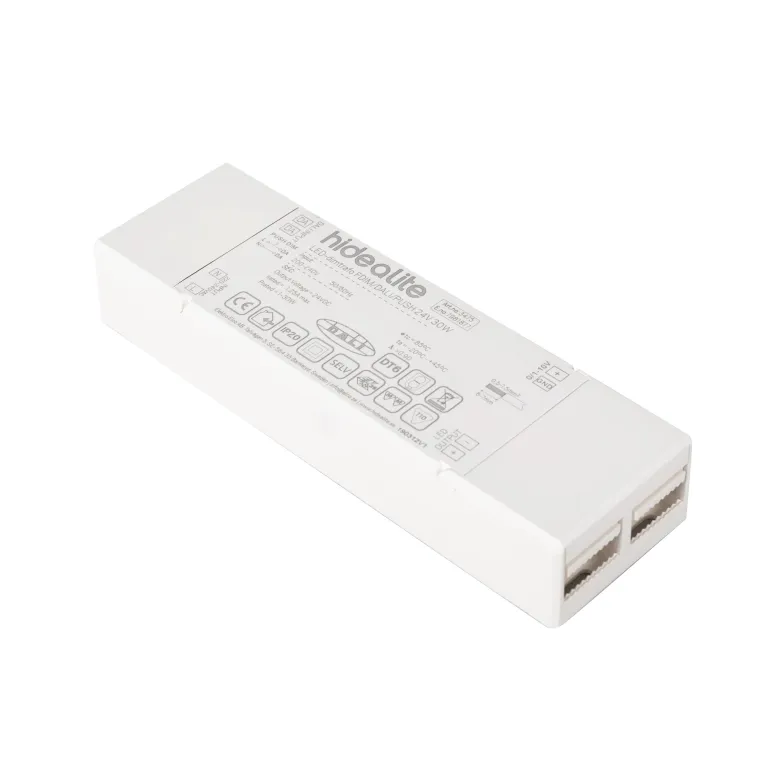 Hide-a-Lite Dali/Push/FDIM on tehokas himmenninmuuntaja 24 V LED-nauhoille. Ihanteellinen yksiväristen LED-nauhojen vaihehimmennykseen kiertohimmentimellä. Myös Push (230 V)-, DALI- tai 0/1-10 V -himmennys. Muistitoiminto sytyttää sähkökatkon jälkeen viimeksi asetettuihin arvoihin.