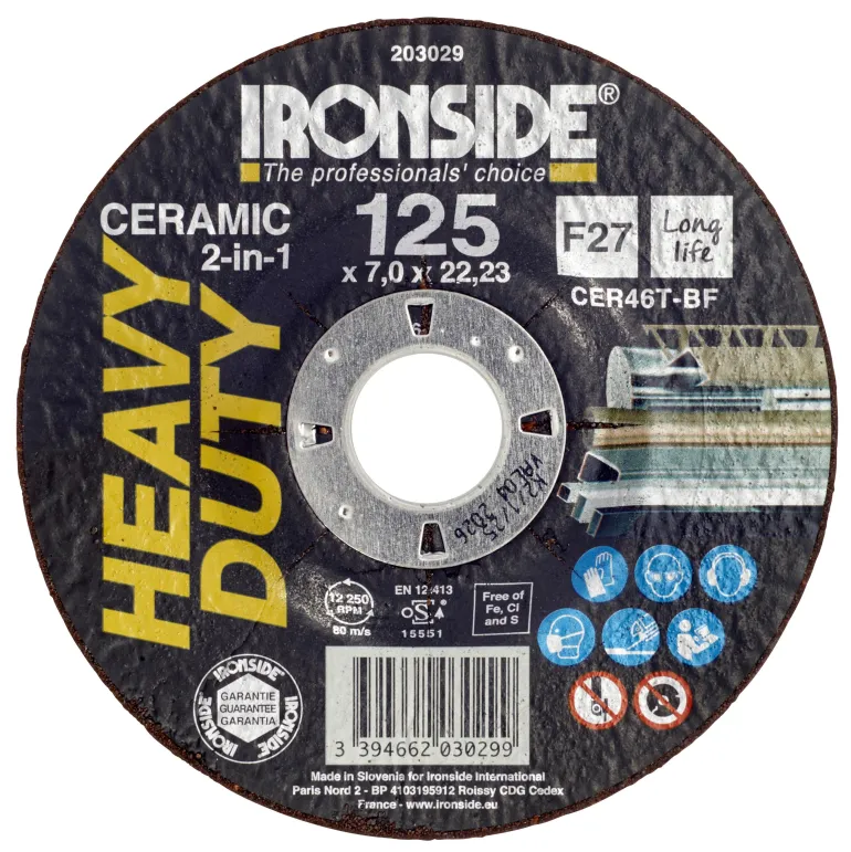 Ironside 203030 on keraaminen hiomalaikka teräksen ja ruostumattoman teräksen hiontaan kulmahiomakoneella. Korkealaatuinen laikka itseteroittuvilla keraamisilla rakeilla. Rakenne pidentää käyttöikää ja mahdollistaa tehokkaamman materiaalinpoiston vähemmällä voimalla. Alempi työskentelylämpötila. Soveltuu raudalle, teräkselle ja ruostumattomalle teräkselle.