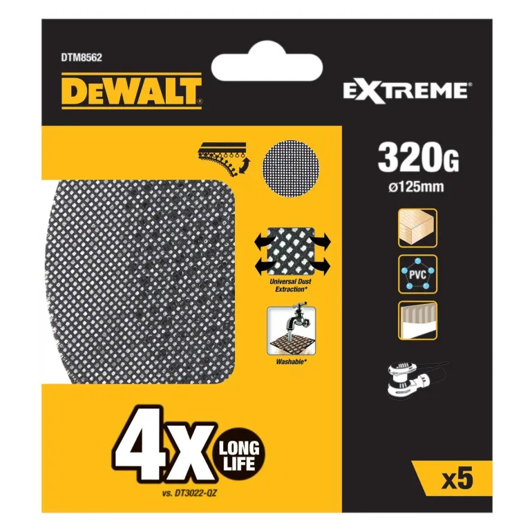 Hiomaverkon avoin rakenne minimoi tarkan asemoinnin tarpeen. Tarranauhakiinnike kiinnittyy nopeasti hiomakoneeseen ja pitää arkin paikallaan. Sopii puun ja maalattujen pintojen hiontaan. Piikarbidirakeiden ansiosta käyttöikä on jopa neljä kertaa pidempi kuin DEWALT-vakioarkeilla. Pöly voidaan helposti pestä pois. Kuivauksen jälkeen verkko on taas käyttövalmis. Soveltuu käytettäväksi kaikkien yleishiomakoneiden kanssa.