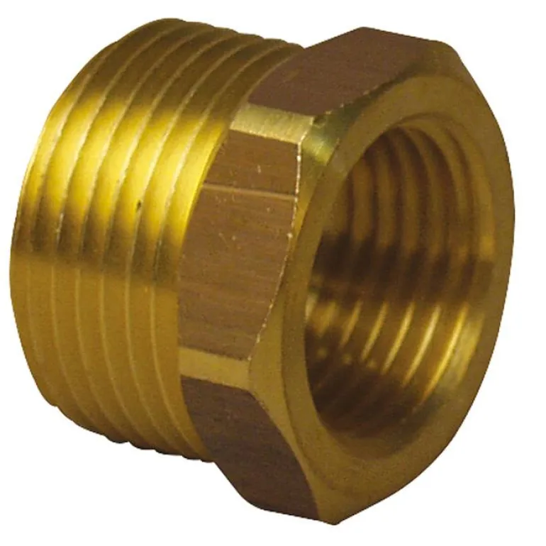 Uponor PEX-putken holkki komponenttiin tai putkiosaan, suora muoto, valmistettu messingistä. Mallissa on ulko- ja sisäkierre G15 x G20.