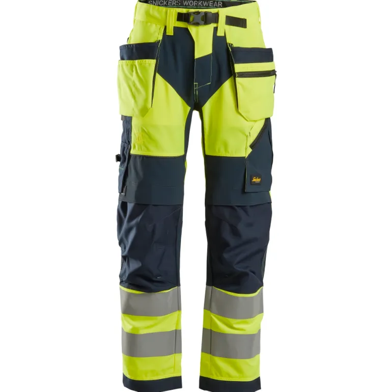 Snickers 6932 keltaiset FlexiWork-työhousut tuovat työmukavuutta ja joustavuutta turvallisella huomiokankaalla. Superkevyissä työhousuissa on huipputekninen body-map-muotoilu, joka yhdistää hengittävän joustomateriaalin ja Cordura®-vahvikkeet. Suuret kotelotaskut kaikille työkaluille, liikkuvuus ja toiminnallisuus huippuluokkaa.