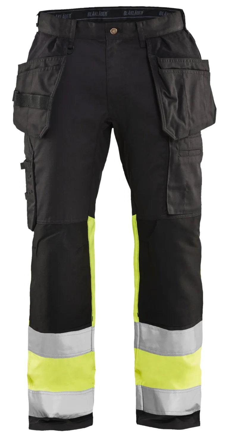 Kevyet ja mukavat huomiohousut kestävästä mutta joustavasta materiaalista, joka kestää kulumista ja vaativia ympäristöjä. Housuissa on erityisen hyvä liikkuvuus, sillä niissä on joustavat kaitaleet haaroissa, polvissa ja takamuksessa. Polvitaskuissa joustavat CORDURA®-vahvikkeiset, jotka lisäävät mukavuutta polvillaan työskenneltäessä. Housuissa on useita käytännöllisiä taskuja ja harkittuja yksityiskohtia, jotka parantavat niiden suorituskykyä. Sisäpuolinen puhelintasku, kolmiosaiset naulataskut ja taittomittatasku, jossa puukkopidike ja kynätasku. Materiaali: 65 % polyesteria, 35 % puuvillaa, twill, vettähylkivä käsittely, 240g/m². Pesuohje: 40 °C.