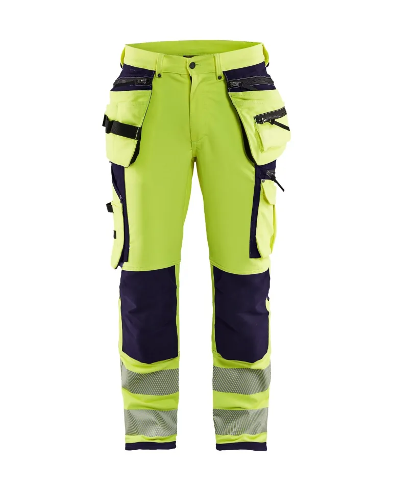 Lahkeensuissa CORDURA®-vahvikkeet. Kiristysnyörillä säädettävät lahkeensuut. Yhteissertifiointiryhmä Y. Sepalus muovivetoketjulla. Leveät lenkit takana ja sivuilla. Sivuilla kaksi lenkkiä, joissa napit vasaranpidikkeille. D-rengas. Metallinapit. Puukkopidike napilla. D-rengas vyötäröllä. Sisäsaumassa kaksipisto-ommel. Laskokselliset takataskut, joissa vahvikkeet, yksi läpällinen takatasku. Laskoksellinen reisitasku läpällä ja tarranauhakiinnityksellä, sisäpuolinen puhelintasku verkkomateriaalia. Vetoketjullinen reisitasku. Avotaskut. Polvisuojataskut. Naulataskut – erittäin leveät, varustettu työkalulenkeillä, työkalulokeroilla ja vetoketjullisilla lisätaskuilla. Vahvistettu taittomittatasku, jossa puukkopidike ja kynätasku. CORDURA®-vahvikkeet lahkeensuissa. CORDURA®-vahvikkeet naulataskuissa, takataskuissa ja taittomittataskussa. Polvitaskuissa joustavat CORDURA®-vahvikkeet. 4-suuntainen joustomateriaali. 70 mm leveät katkoheijastimet. Heijastimet lahkeiden ympärillä. Polvisuojataskut. Heijastin Naulataskut. Joustavaa materiaalia. Materiaali: 94 % polyesteria, 6 % elastaania, vettähylkivä käsittely, 4-suuntainen joustomateriaali, 330g/m². Pesuohje: Pesukertojen määrä: x 20. 40 °C. Ei valkaisua. Ei kuivapesua. Ei silitystä. Älä käytä kuivausrumpua.