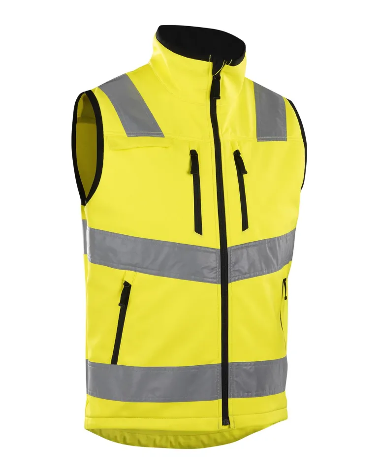 Moderni softshell-liivi huomiovärisestä ja vedenpitävästä kankaasta, joka hengittää. Liivissä on korkea kaulus ja pehmeä fleecevuori.