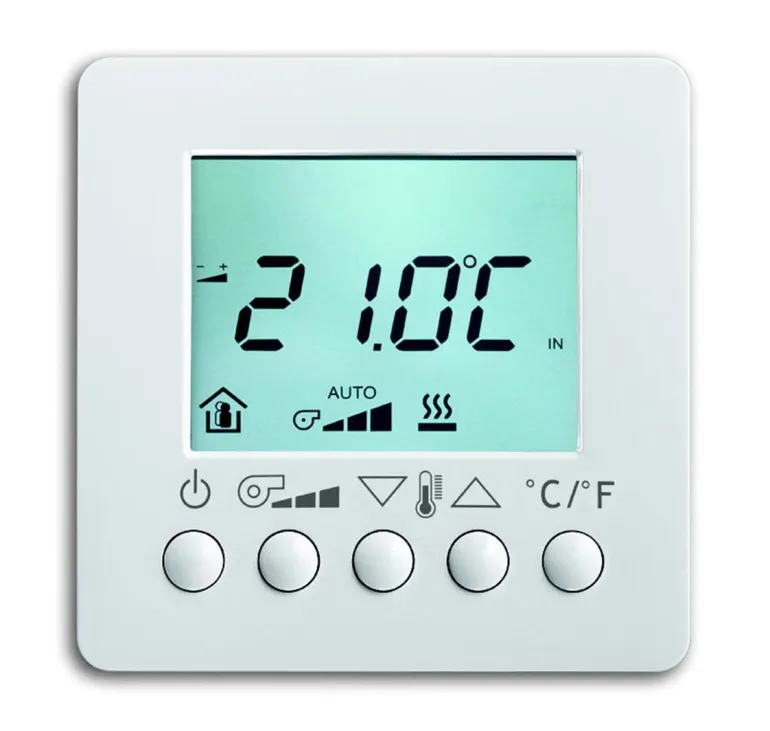 Termostaatti, jossa on sisäänrakennettu väyläliitäntäyksikkö huoneen lämpötilan säätelyyn. LCD-näyttö viidellä painikkeella LVI-järjestelmän ohjaamiseen kahden tai neljän putkiliitännän ja perinteisten vaihtovirtalaitteiden avulla.