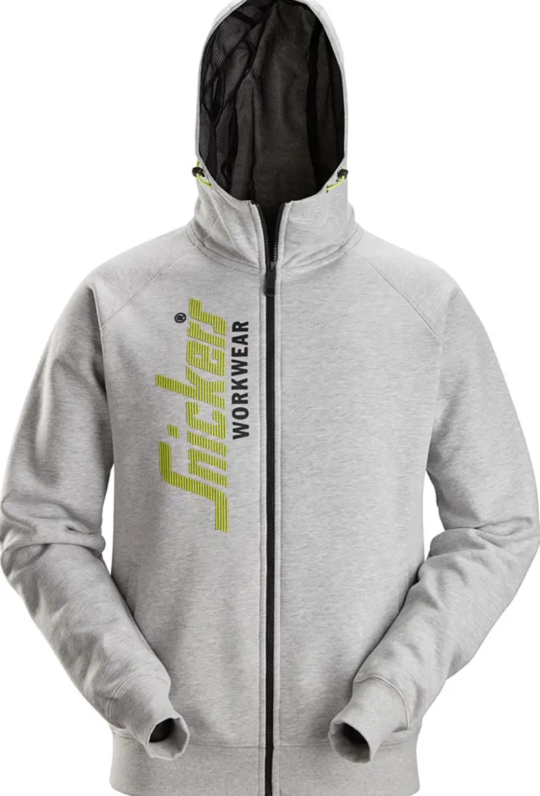 Snickers 2846 on vetoketjullinen huppari Snickers Workwear-logopainatuksella, korkealla kauluksella ja harjatulla sisäpuolella. Sivutaskut verkkovuorella.