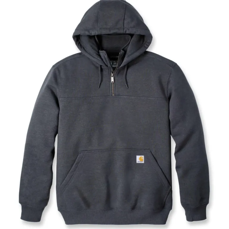 Carharttin tummanharmaa huppari 55% puuvillaa ja 45% polyesteria. Kestävää vettä hylkivää DWR -fleecemateriaalia (Heavyweight/Rain Defender™ -viimeistely). Loose Fit -istuvuus, materiaalin paino 13 oz/yd² – 441 gsm. Rain Defender™ -viimeistely ja DWR -pinnoite tekevät materiaalista vettä hylkivän, jotka pitävät sinut kuivana kevyessä sateessa. Hupparissa on hyvin suojaava huppu säädettävällä kiristysnyörillä, tilava etutasku käsien lämmittämiseen ja kätevä puolipitkä vetoketju, joka helpottaa pukemista ja riisumista. Lisäksi hupparissa on joustavat, elastaanilla vahvistetut resorit hihansuissa ja helmassa (ribbineulosta), jotka parantavat istuvuutta.