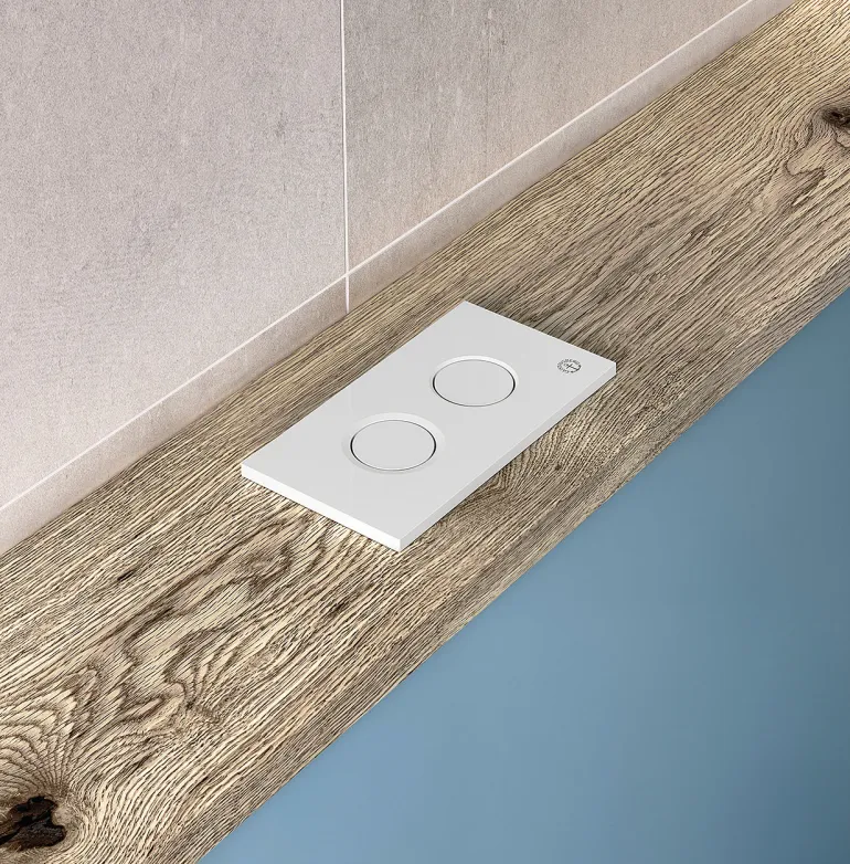 Pneumaattinen huuhtelupainike kaksitoimiseen huuhteluun. Valkoista muovia.