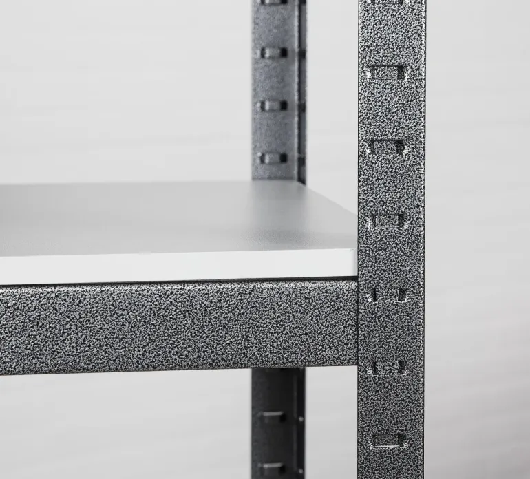 Tukeva ja vakaa hylly, jossa on viisi hyllyä (jokainen hyllytaso kestää 500 kg:n kuormituksen). Helppo asennus ilman pultteja – vasara tai kumivasara riittää.