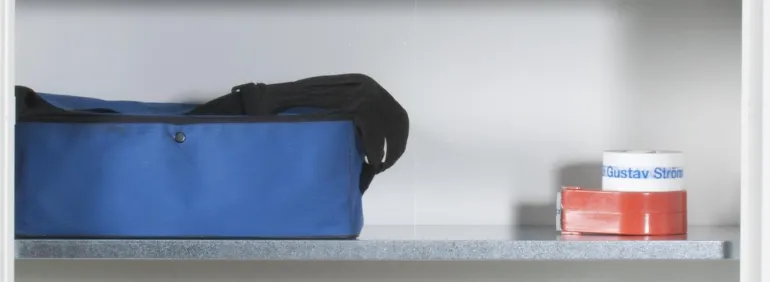 Ruotsalaisvalmisteisen, tukevan 84D-työpajakaapin hylly pellistä. Vankka kaappi kestää raskaankin kuormituksen.