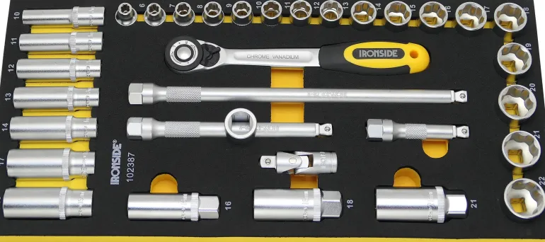 33-osainen 3/8″ hylsysarja, joka sisältää räikkävääntimen ja kuusikulmaisia Flankdrive-hylsyjä eri kooissa. Osat mattakromattua kromivanadiiniterästä. Ergonomisesti muotoiltu räikkäväännin lukitusvivulla, jossa peukalon kahvan säätö, 72 hammasta.
