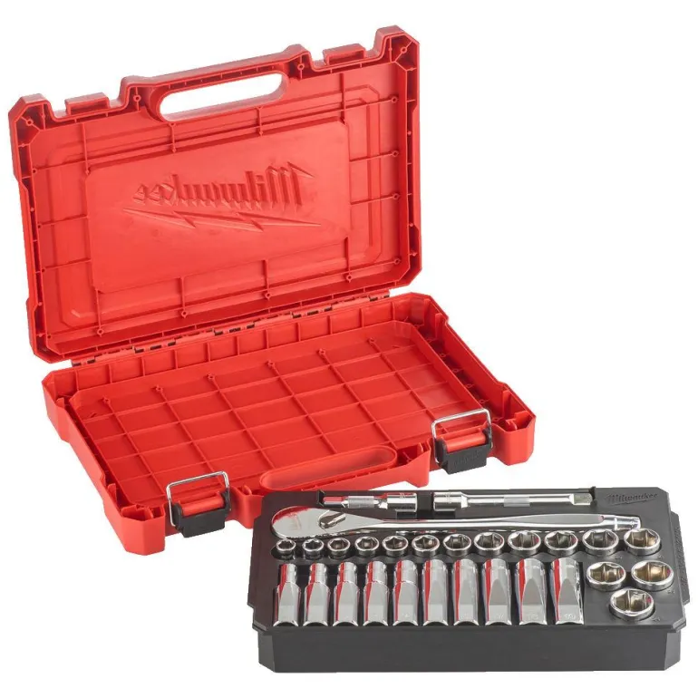 Milwaukee 4932471864 on hylsyavainsarja, jossa hylsyjen mitat on stanssattu tasaiselle puolelle helpon luettavuuden varmistamiseksi. 90-hampainen, 4 asteen kulmaan taivutettu räikkäpää sopii ahtaisiin työkohteisiin