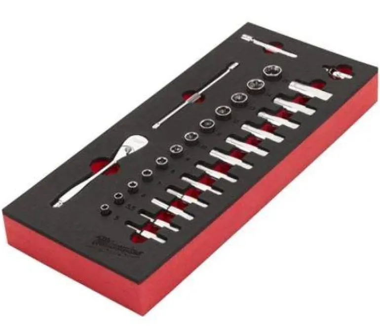 1/4″ hylsyavainsarjan osat sisältävät 12 vakiohylsyä ja 12 pitkää hylsyä, koot 5–15 mm. Pakkauksessa on myös 90-hampainen räikkäpää, jossa on 4° kulma ahtaisiin työtiloihin, sekä kaksi jatkokappaletta.