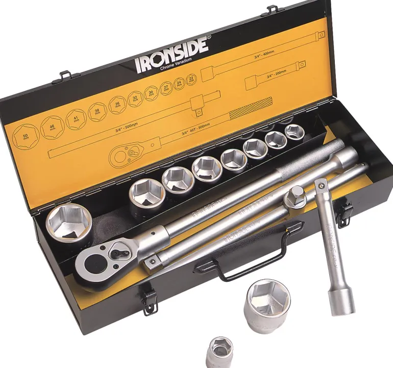 3/4″ kiinnityksellä varustettu hylsyavainsarja, valmistettu kromivanadiiniteräksestä, mukana vahva räikkäavain. Pakkaus sisältää kymmenen 22, 24, 27, 30, 32, 36, 38, 41, 46, 50 mm hylsyä, räikkäavaimen, kaksi jatkokappaletta ja T-kahvan.