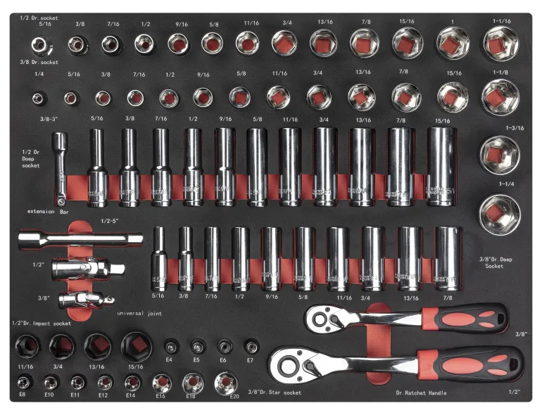 71-osainen hylsyavainsarja, joka sisältää kromivanadiiniteräksestä valmistettuja tuumakokoisia työkaluja lajiteltuna vaahtomuoviseen moduuliin, jossa on oma paikka ja merkintä kullekin työkalulle.