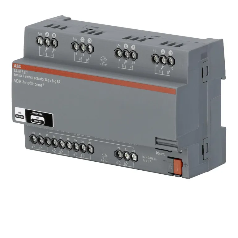I/O-yksikkö, jossa on 8 binäärituloa ja 8 6 A:n lähtöä. Kärkien skannauksella. 8 DIN-moduulia.