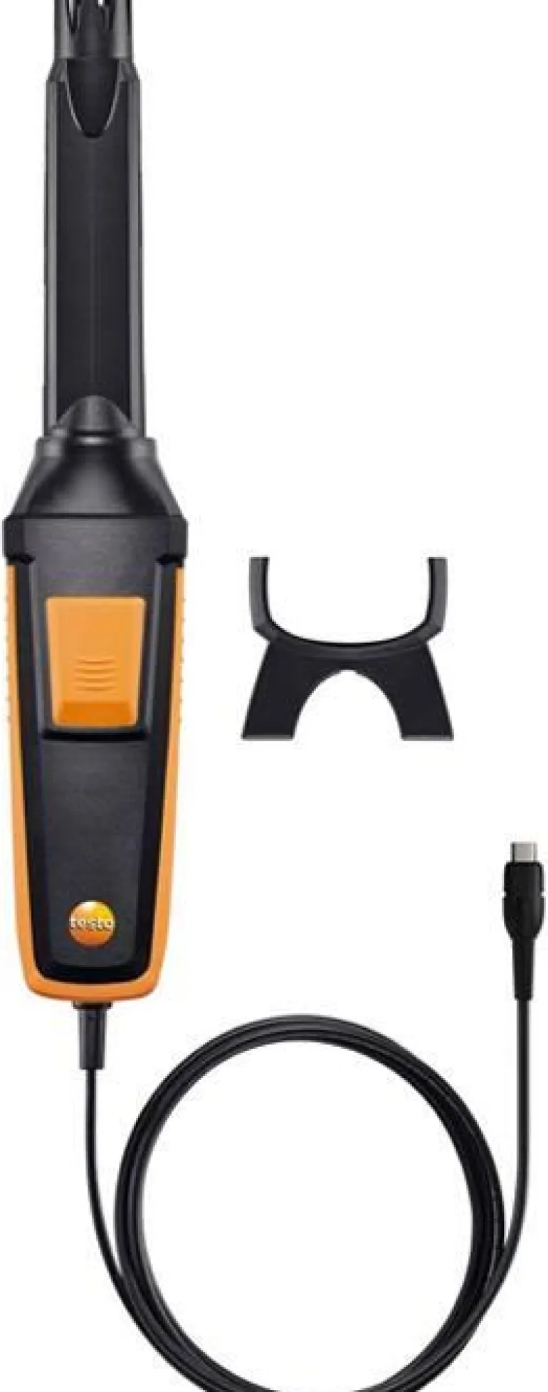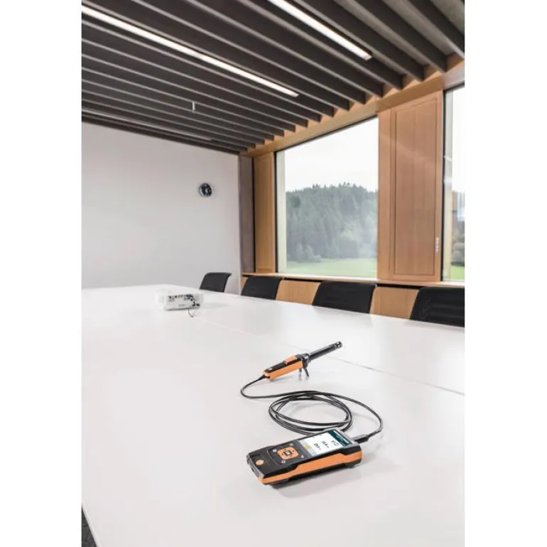 IAQ-anturi lämpötila- ja kosteusanturilla ja kiinteällä kaapelilla (1,4 m) lämpömittariin Testo 440 kytkemistä varten. Mittausalue on 0–10 000 ppm CO2-mittauksessa, 5–95 % suhteellisen kosteuden mittauksessa ja 0–50 °C lämpötilan mittauksessa.