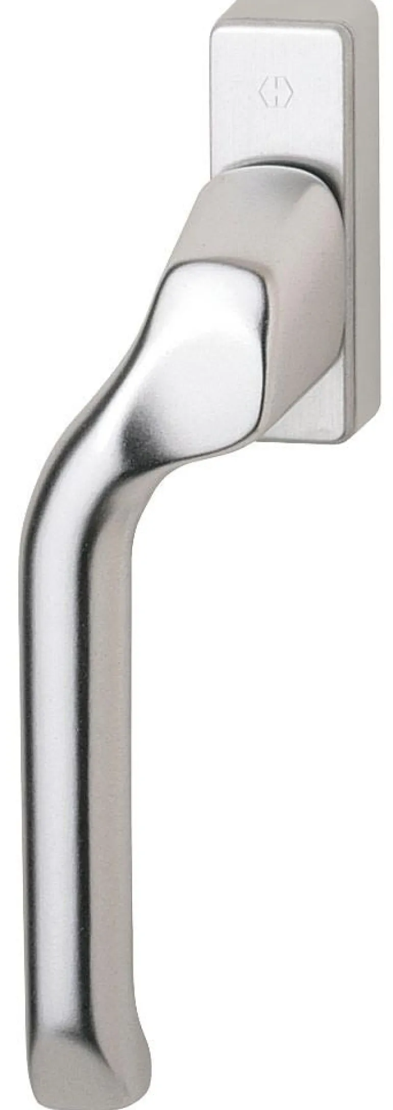 Alumiininen London -ikkunan painike selkeillä 90° pykäliin jaetuilla asennoilla. 10 ohjaustappia. Kara 53 x 7 mm sekä muunnoshylsy 8 mm.