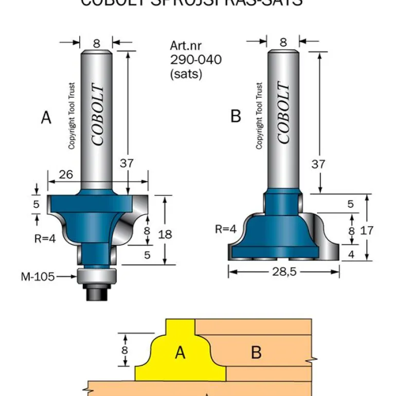 Cobalt-ikkunaristikon jyrsinsarja 290-040. Mukautettu ikkunaristikoita ja ikkunanpuitteita varten.