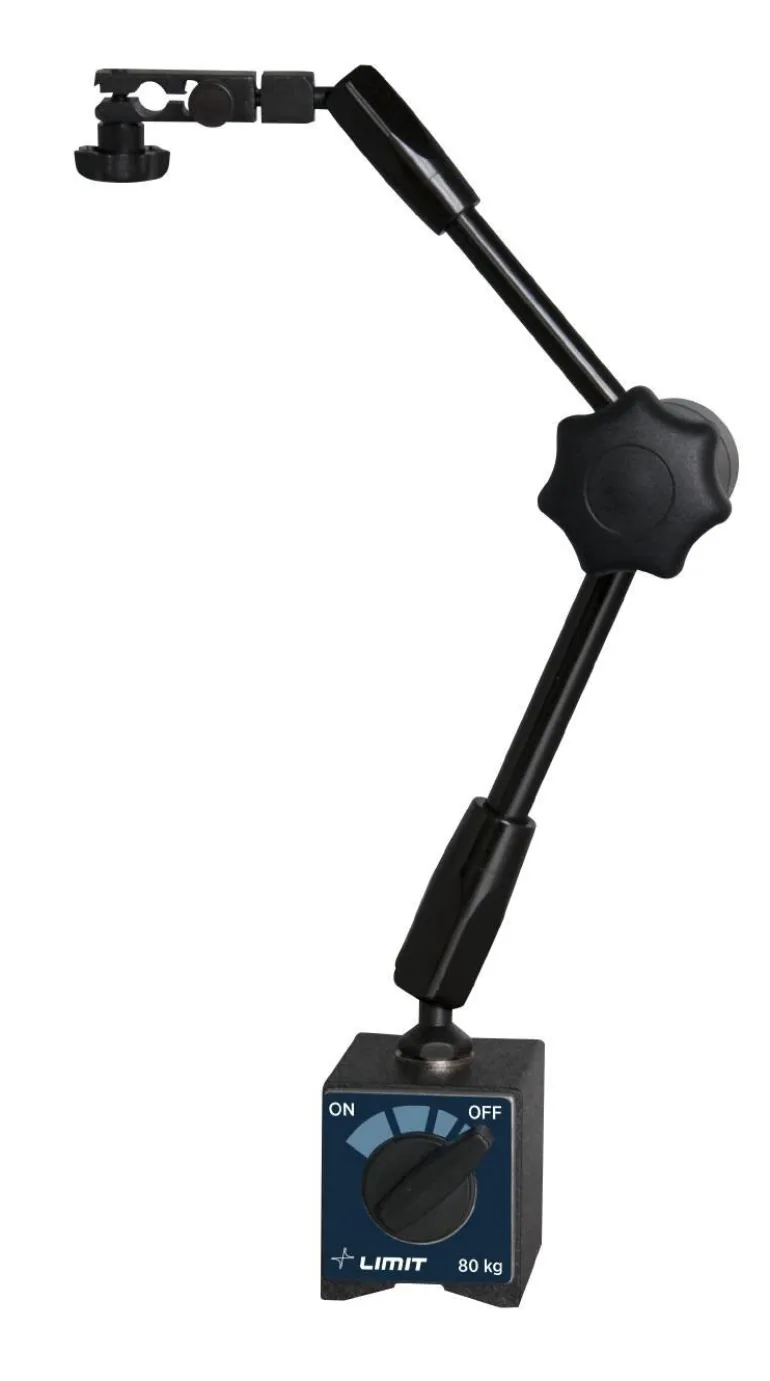 Ylemmässä pidikkeessä hienosäätö. Teline, jossa on reiät mittakellolle ja lohenpyrstöaukko kallistusilmaisimelle. Keskuslukitus ala-, keski- ja ylänivelen vääntönupilla. Magneettinen jalka, jonka alaosassa on V-ura. Toimitetaan ilman mittakelloa.