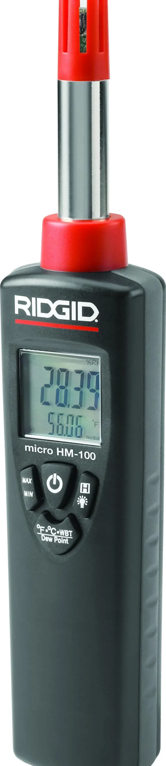 Ridgid HM-100 on kosteusmittari, joka mittaa ilman lämpötilan ja kosteuden helposti ja tarkasti. Kastepisteen ja märkälämpötilan laskenta, 4½ kaksinkertainen taustavalaistu LCD-näyttö.