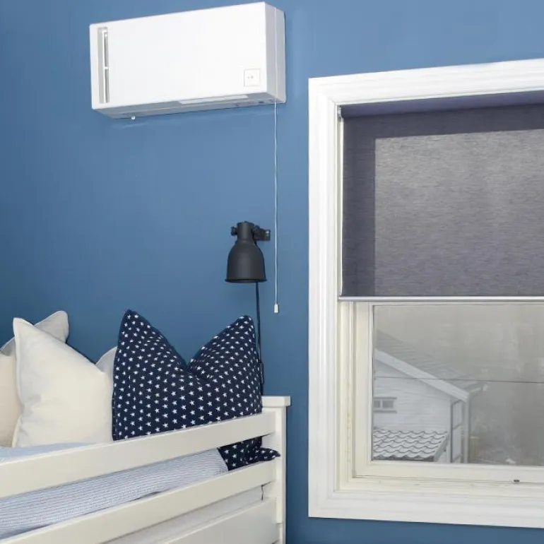 Haju, home, siitepöly, radon ja monet muut samanlaiset tekijät vaikuttavat sisäilmaan ja sisätiloissa oleskelevien hyvinvointiin. Ikkunoiden pintaan kertyvä kosteus on eräs merkki huonosta ilmanvaihdosta. Ilmanvaihtolaitteemme ansiosta parannat sisätilojesi energiatehokkuutta, sillä sen lämmönkierrätystoiminnon ansiosta lämpötilatehokerroin on jopa 85 %. Ilmanvaihtolaitteemme on kapeasti muotoiltu sopimaan kotiympäristöön ja sen äänieristyksen ansiosta se on myös hyvin hiljainen. Näin arkesi ei häiriinny! Tämä ilmanvaihtolaite kattaa enintään 80 m² tilan. Asennus on erittäin helppoa – tarvitset vain yhden reiän seinään ilmanvaihtoputkea varten. Asennus vaatii yleensä vain muutaman tunnin, ja jos olet kätevä käsistäsi, voit asentaa sen aivan itse.