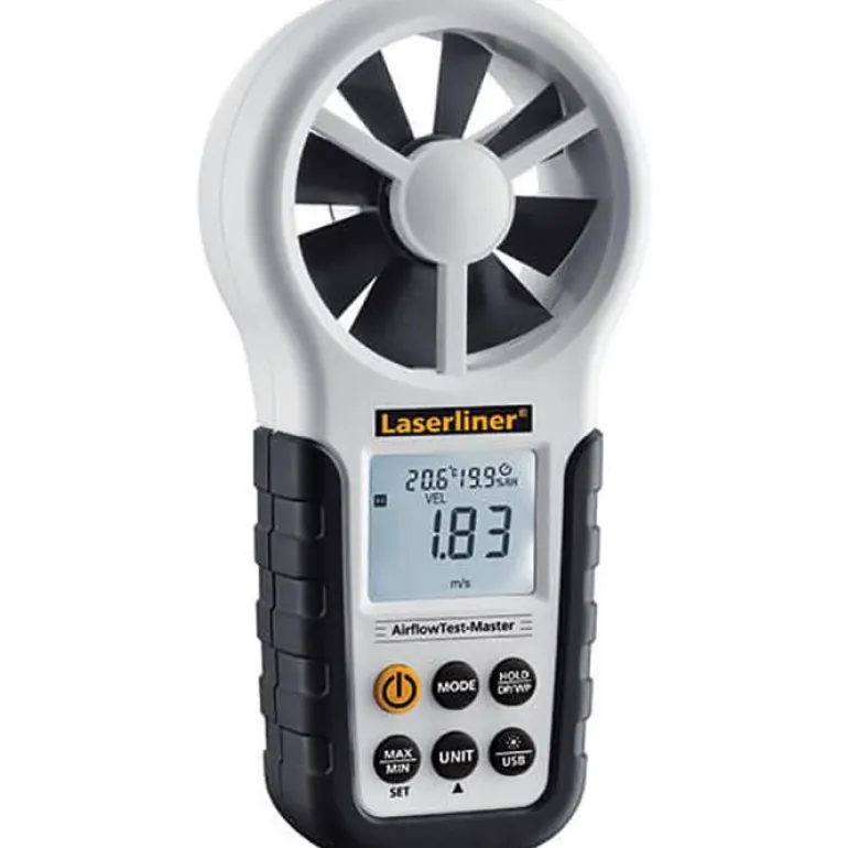 Laserliner AirFlowTest-Master on ammattimainen ilmavirtausmittari ilmavirtoje, volyymivirtojen ja tuulennopeuksien mittaamiseen. Integroidulla anturilla ympäröivän tilan lämpötilan ja suhteellisen ilmankosteuden mittaus sekä kastepisteen lasku.