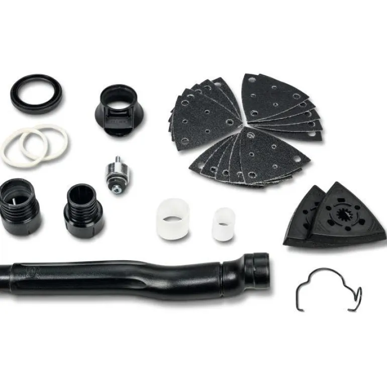 Imusarja hionta- ja raspaustyöhön, kolmikulmainen hiomalevy ja kovametalliraspi. Sarja sisältää kaksi rei’itettyä hiomalevyä, 15 rei’itettyä hiomapaperia, imukupu, jossa imuputki, kaksi letkuhylsyä ja kaksi sovitinta yleisimpiin kotitalouksien pölynimureihin liittämistä varten. Sopii yhteen FSC 2.0 Q:n kanssa.