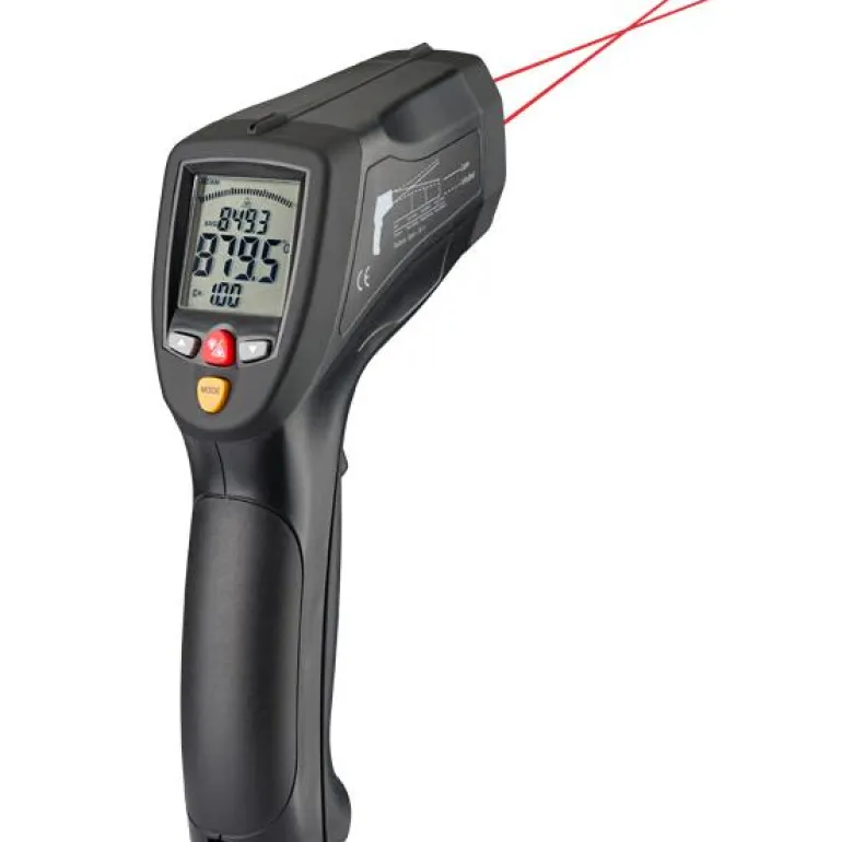 Tämä infrapunalämpömittari mittaa lämpötilan –50 °:sta +1 600 °C:een kohteeseen koskematta ja käyttää laserkohdistinta. Säädettävä emissiivisyys ja 50:1-optiikka.