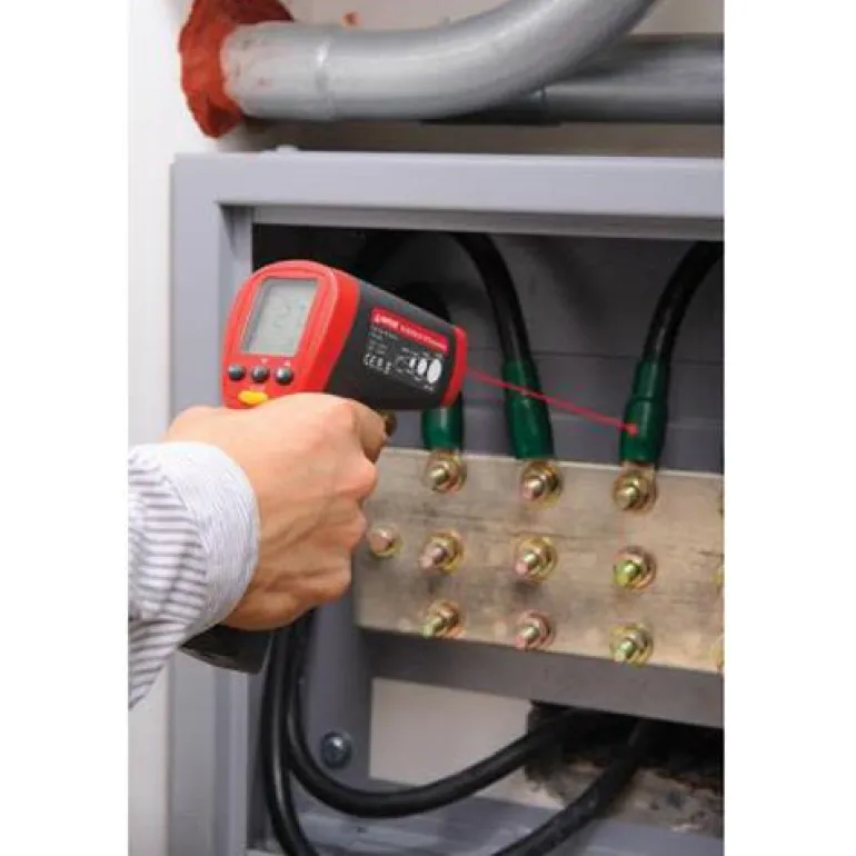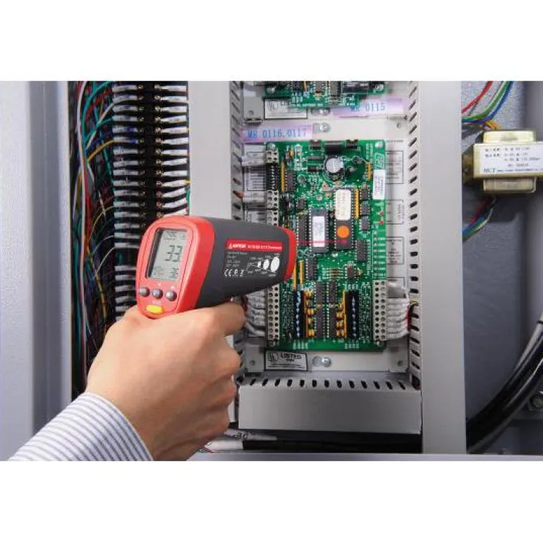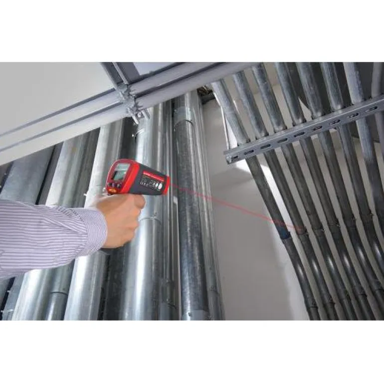 Infrapunalämpömittari, joka mittaa lämpötiloja välillä -32…1250 ° C. LVIS, sähköinen teollinen huolto, ajoneuvot sekä laadunvalvonta ja palontorjunta.