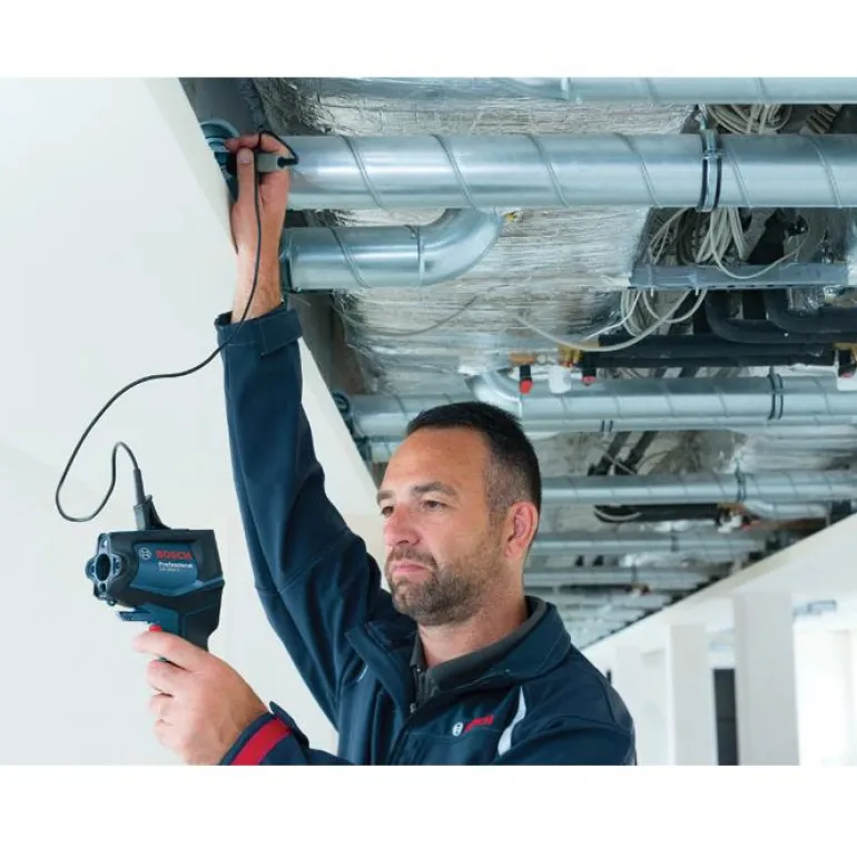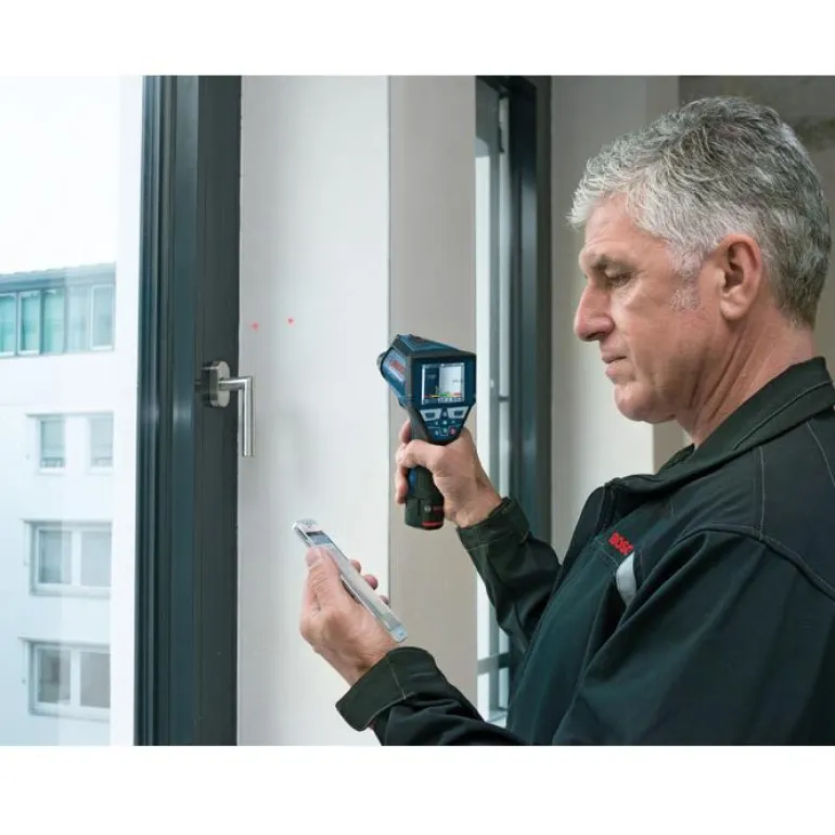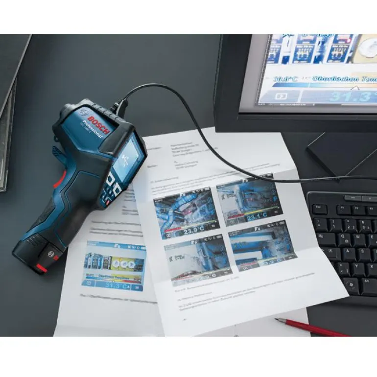 Bosch GIS 1000 C on 10,8 V:n IP-lämpömittari, jossa on integroitu kamera mittausarvojen dokumentointiin. Varustettu Bluetooth-yhteydellä mittausarvojen siirtämiseksi älypuhelimeen tai tablettiin.